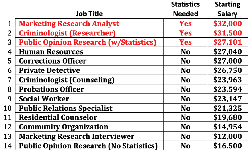 By sorting the table on salary, the fact becomes very clear that the starting salaries for jobs that require statistics are higher than those that do not. The average (mean) salary for a job that demands statistics is $30,200 versus $21,450 for those jobs that do not require statistics. The difference is $8,750. Jobs requiring knowledge of statistics pay nearly 41% more than the listed jobs that do not require statistics. Although this quick comparison lacks the rigor that we will demand when we conduct Null Hypothesis Significance Tests, the implication is clear: If you want to earn more money, learn statistics.