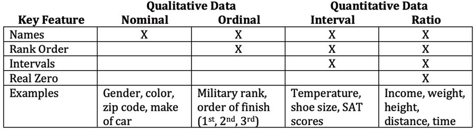 According to Stevens, there are four measurement levels are Nominal, Ordinal, Interval, and Ratio. The mnemonic I use to remember the four levels of measurement is NOIR, the French word for black.
