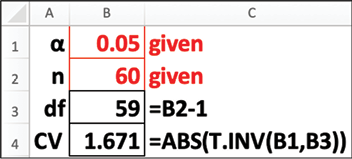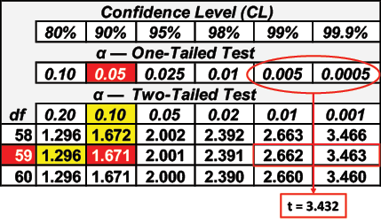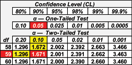 You decided to use a 5 percent significance level. The critical value of t for a right-tail test with 59 degrees of freedom is 1.671. The critical value for t can be found using the Studentt table or Excel. Table 14 shows the critical value of t using the Student-t table. Table 15 shows the calculation in Excel. The syntax for the Excel formula is shown in Equation 8.