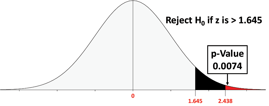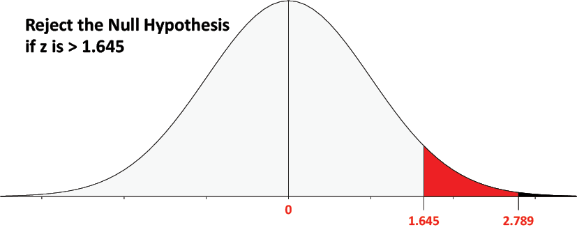 Because we are conducting a right-tail test at a 5 percent significance level, the rejection region will cover the upper 5 percent of the normal curve. The rejection region starts at a zvalue of 1.645 as shown in Figure 6.