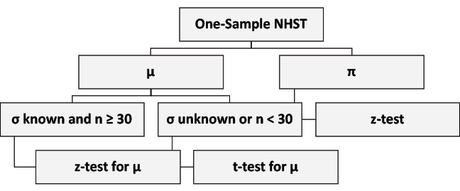 Figure 2 shows the three one-sample hypothesis tests covered in this chapter. To conduct a test of the mean, μ, we use the normal distribution and zvalues when the population standard deviation, σ, is known and the sample size, n, is equal to or greater than 30. When n is less than 30 or the population standard deviation is unknown, we use the Student-t distribution. When testing the population proportion, π, we use z-values.