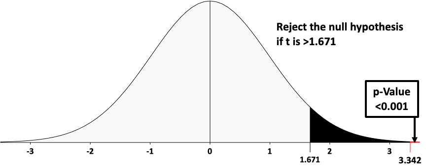 The t-value for our test is 3.432 and the p-value is <0.001. We have sufficient evidence to reject the null hypothesis and conclude that the difference between the 5-minute waiting time for our sample and the presumed population mean of 4 minutes is statistically significant. This difference is greater than what we would expect from sampling error. Conclusion: Callers are waiting longer than four minutes to speak to Technical Support. Figure 17 charts this finding with the test statistic of 3.432 clearly in the rejection region.