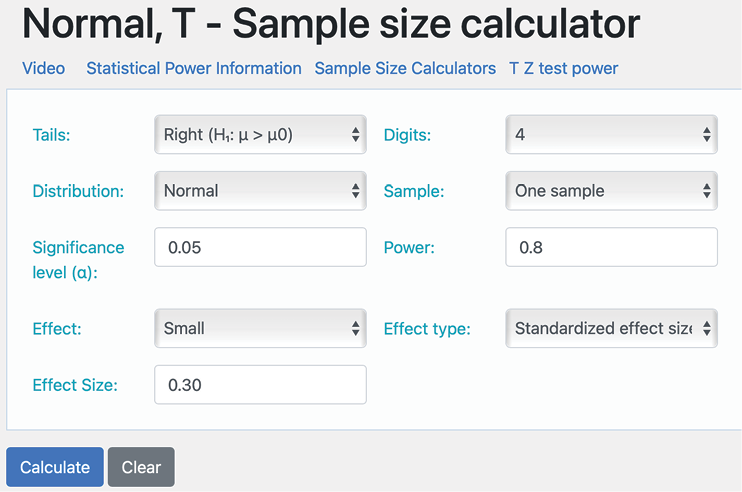 One of the first things the researchers need to do is to conduct an a priori statistical power calculation to determine the appropriate sample size. G*Power lacks a calculation for a onesample z-test for the mean so we will use the sample size calculator found on the Statistics Kingdom website.