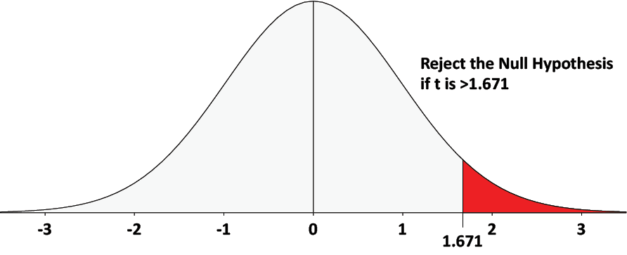 Decision rule: Reject the null hypothesis if t is greater than 1.671. Figure 16 shows a chart of the t-distribution with 59 degrees of freedom and a 5 percent rejection region on the right tail.