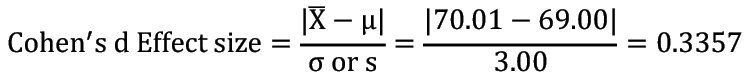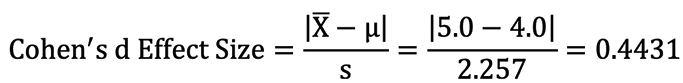 Effect Size: We adapt the formula for Cohen’s d effect size by substituting the sample standard deviation, s, for the population standard deviation, σ. Equation 10 shows the formula and the effect size for this problem, 0.4431, which is a small effect size. See Table 17 for how Cohen’s d effect sizes are interpreted.