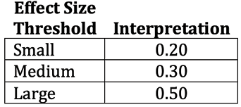 The effect size used by the Statistics Kingdom calculator is Cohen’s d. Table 1 shows the Cohen’s d effect size thresholds and how Cohen’s d is interpreted. Anything less than 0.2 is considered a negligible effect. Effect sizes between 0.2 and less than 0.5 are small effects. Effect sizes between 0.5 and less than 0.8 are medium effects. Effect sizes of 0.8 and higher are considered large effects.