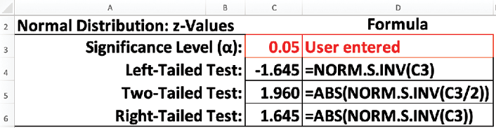 We can also determine the critical value of z using Excel. The Excel workbook finding-critical-values-and-p-values.xlsx has a calculator for left-tail, two-tail, and right-tail tests on the Critical Value Calculator worksheet for any significance level. See Table 4 for these calculations along with the Excel formulas for left-tail, two-tail, and right-tail tests.