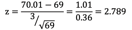 For our first example, we will conduct a one-sample null hypothesis test for the mean using z-values. Here is our problem: Based on past studies, the average man in the United States is assumed to be 69 inches tall (5’9”); the μ, therefore, equals 69 inches. The population standard deviation, σ, is presumed to be 3 inches. Executives at Dubiety Insurance think these parameters underestimate the height of American men. Researchers have been tasked with conducting a study to answer the following question: Is the average American man taller than 69 inches (5’9”)?