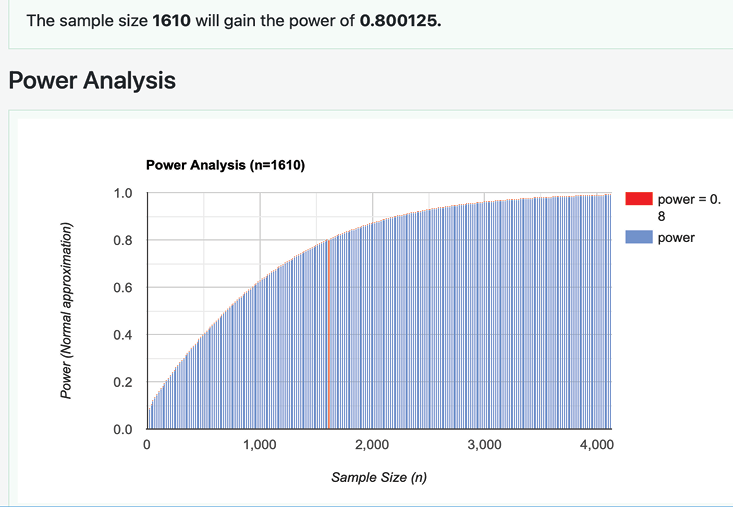 • Power: 0.8. This is the desired level of statistical power. This means that the tolerance of a Type II error is 0.2 or 20 percent.