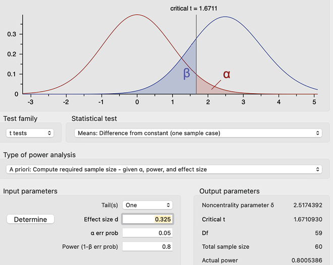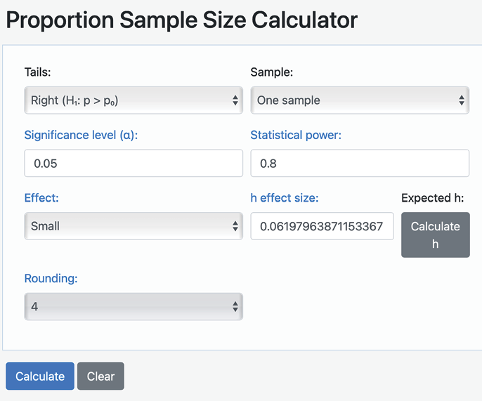 • Determine the necessary sample size by conducting an a priori power analysis using Statistics Kingdom’s online power calculator and G*Power.