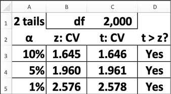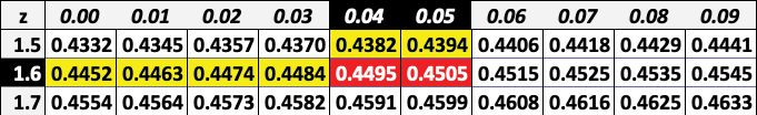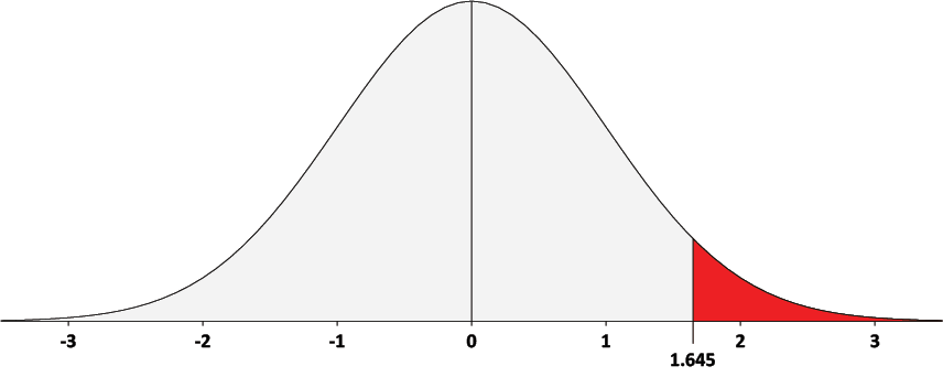 Please note: The critical value found using Excel, 1.645, is more precise than using either 1.65 or 1.64. We will, therefore, use 1.645.