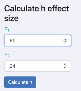 Conduct a null hypothesis significance test using the appropriate test statistic. Using the Statistics Kingdom sample size calculator, calculate a priori statistical power. Let’s Statistics Kingdom calculate Cohen’s h effect size. Is this test under-powered?