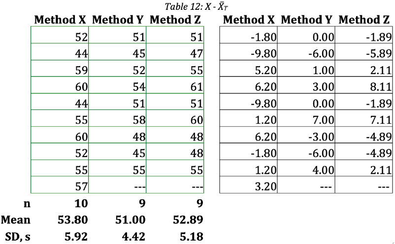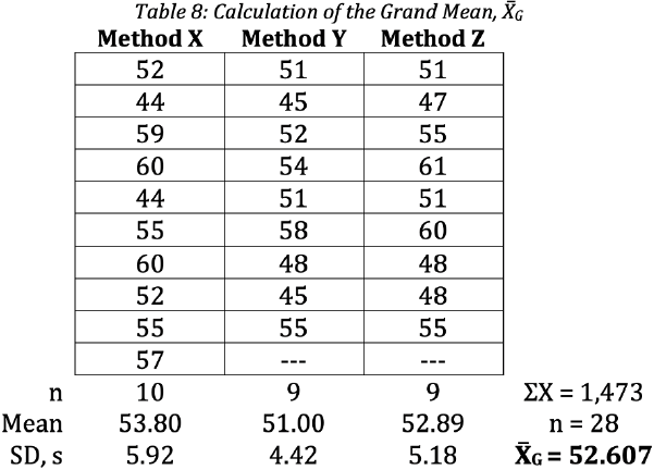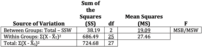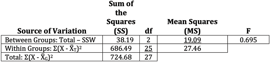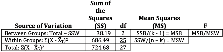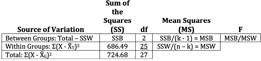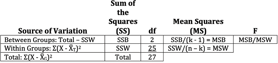 Here are the steps to construct an ANOVA table by hand. This is the kind of test typically presented in introductory textbooks. We will, however, supplement our calculation with Excel, G*Power, and online power calculators. We will find that performing the relatively small number of calculations for this example time consuming. In addition, this test will lack sufficient statistical power.