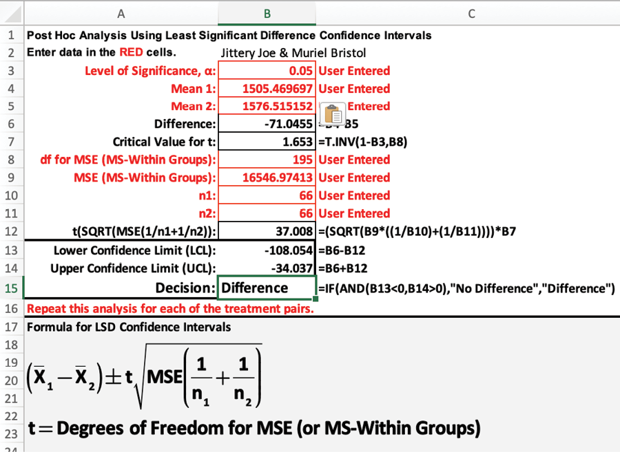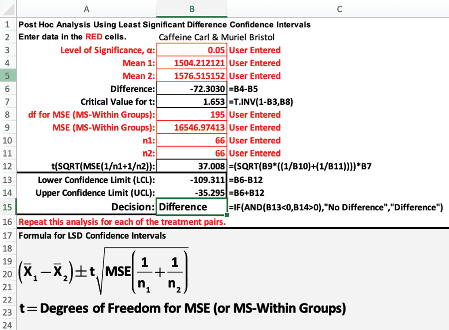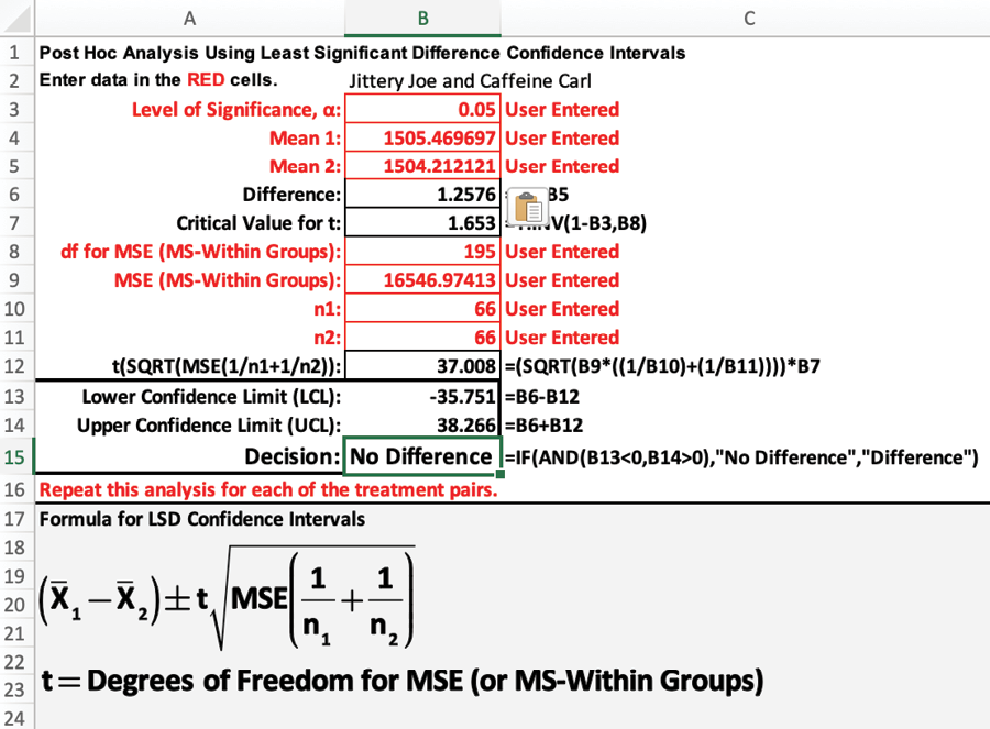 Calculating the LSD confidence intervals by hand can be time consuming. While Excel lacks built-in post hoc analysis functions, you can use the attached LSD confidence interval template found in 16_ANOVA_Power_PostHoc.xlsx to conduct this analysis quickly. Enter the data for the red cells. These data are in your completed ANOVA table. Remember: You must construct LSD confidence intervals for all the treatment pairs.