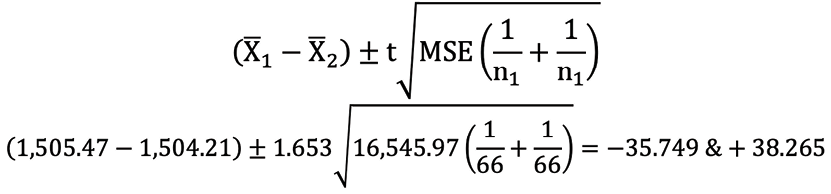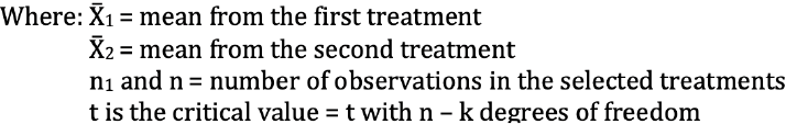 As previously stated, ANOVA is an omnibus test. We now know that the three treatment pairs are not all equal, but we do not know which treatment pairs are not equal. A post hoc analysis is required to answer this question. There are many types of post hoc analyses, the simplest of which is to construct a series of confidence intervals. We need to create Least Significant Difference (LSD) confidence intervals for all the pairs: