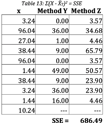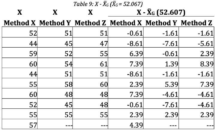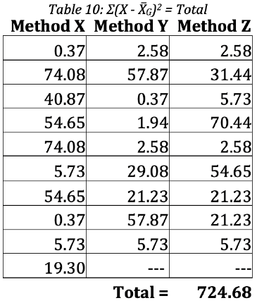 We start with the Sum of the Squares (SS) column. First we calculate Total. To repeat, Total is the sum of the squared deviations of each variable, X, regardless of treatment from the Grand Mean, . The formula for Total is: