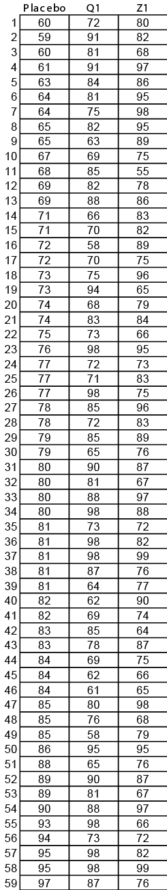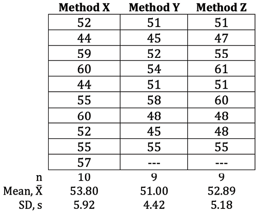 Pützmeister Schwing Ltd. is a large multinational pharmaceutical company headquartered in Transylvania. The company has been developing an over-the-counter medication to help students improve their memory and focus so they can perform better on exams. As part of the test, 177 accounting students attending Nunya School of Business were randomly assigned to one of three treatment groups. The first group was given a placebo. The second group was given formula Q1 and the third received formula Z1. Participants in each group were given one week to prepare for a standardized accounting examination. Possible scores on the exam range from a low of zero to a high of 100. The test results are shown in Table 26: