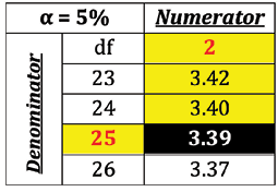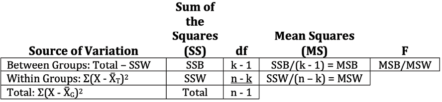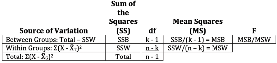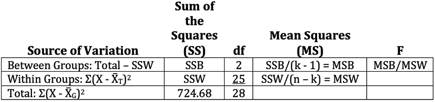 With the Mean Squares calculated, we complete the ANOVA table by moving one column to the right and calculate the F-value, which is the ratio between MSB and MSW. Equation 6 shows this formula: