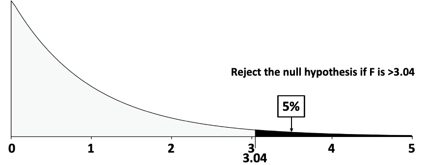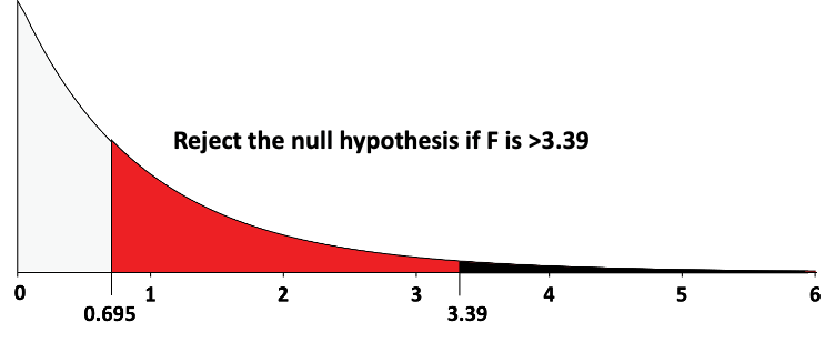 Our decision: Reject the null hypothesis because the value of the F test statistics, 6.85, is greater than the critical value of 3.04 and the p-value of 0.14 percent is less than the 5 percent significance level. We conclude that there is a statistically significant difference in daily sales among the three vendors. Given this low p-value, we would also reject the null hypothesis had we used a stricter 1 percent significance level. There is little chance that our findings are due to random sampling error or that our measurement of effect size is unreliable. This test is also not overpowered, given the fact the ES is not negligible. Conclusion: The three hot beverage stands do not have equal daily sales.