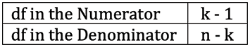 The next step is to find the degrees of freedom for SSB, the degrees of freedom found in the numerator, and for SSW, the degrees of freedom found in the denominator. The formulas for these degrees of freedom are shown above in Table 1. We could, however, find degrees of freedom before we calculate the three Sum of the Squares. Please note: As previously stated, the SS Total has its own degrees of freedom, found by n minus 1, where n stands for the total number of observations. This figure, however, is not used for finding the critical value of F or the value of the F statistic.