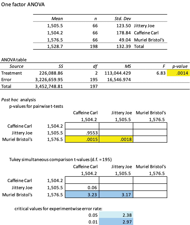 Please note: Some commercial Excel plug-ins like MegaStat conduct a post hoc analysis when the ANOVA test is performed. Figure 29 shows the ANOVA test results with two post hoc analyses: 1) Pairwise t-tests and 2) a Tukey simultaneous comparison t-values test. Information about MegaStat can be found at this link. Dedicated statistical programs like SPSS can run a wide variety of post hoc analyses when the ANOVA test is conducted.