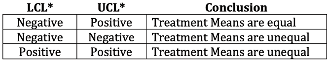 We interpret the results of our LSD confidence intervals by looking at the lower and upper confidence limits. Table 23 shows how we interpret the results: