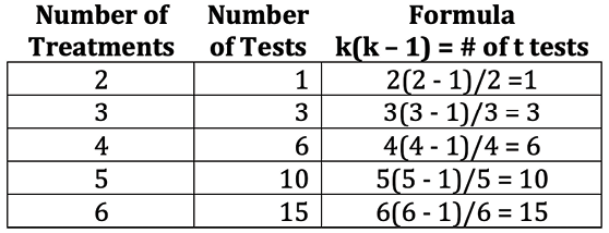 For three treatments there are three pairs, for four treatments there are six pairs, and for five treatments there are ten pairs.