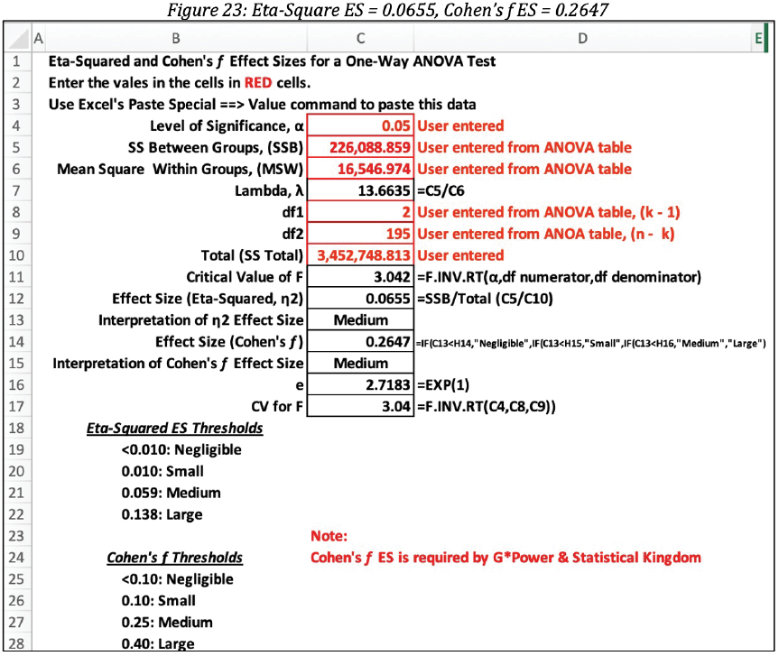 The One-Way ANOVA test is a relatively simple and extremely useful way to determine whether two or more independent samples have equal means. When we meet the basic assumptions of the ANOVA test, Microsoft Excel is a very handy tool for analyzing the test results. Unfortunately, Excel’s ANOVA tool has its limitations. It lacks built-in tools to test the assumptions of normality and homogeneity of variance. It does not report either etasquared, η2, or Cohen’s f effect size, which are simple calculations. It does not have built-in a priori or post hoc statistical power functions, but as shown, a custom Excel workbook can calculate post hoc power. Statistical power calculations, however can be easily run using free tools like G*Power and online power calculators like the one found on the Statistical Kingdom’s website. Excel lacks the ability to run post hoc analysis, but setting up a post hoc analysis using least square difference (LSD) confidence intervals is not difficult.