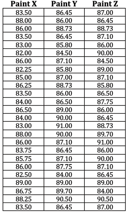 Gotham Paint is testing three prototypes for a new house paint. The paints are labelled X, Y, and Z. The production department wants to determine how quickly the three different paints dry under real-world conditions. To that end, it randomly distributed the three paints to professional house painters. Members of the production staff went into the field with these painters to determine how long it took for the three paints to dry. Table 25 shows the results of this test: