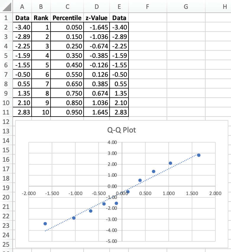 Step 5: Create the Q-Q Plot by: 1) Copy the data from Column A into Column E, 2) Insert and X-Y Scatter chart using Columns D and E to draw the chart, and 3) Add a trend line.