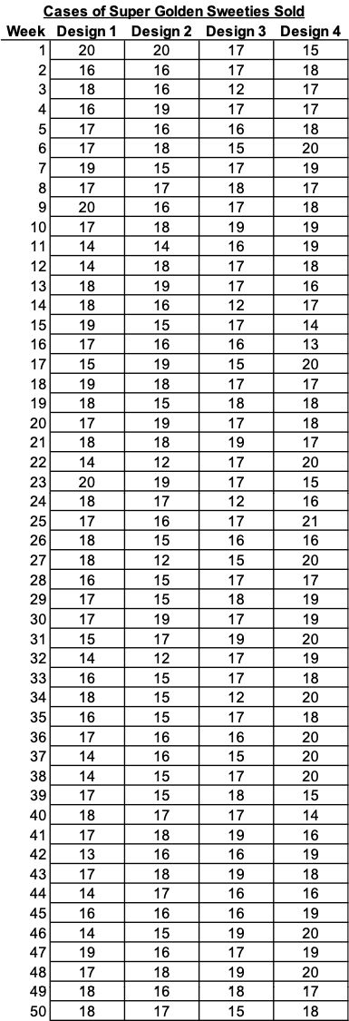 General Cereals is a large manufacturer of pre-sweetened, ready-to-eat children’s cereals. One of its oldest brands is Super Golden Sweeties. As part of its marketing efforts, General Cereals has been running a test market for new package designs for Super Golden Sweeties. The test ran for 50 weeks in small test markets. Table 24 shows the results based on cases sold per week in the test markets for each of the four package designs:
