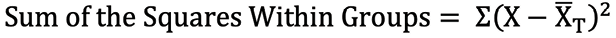 Next we calculate the Sum of the Squares Within Groups, SSW, which is the sum of all the squared deviations of each variable, X, from its particular Treatment Mean, . The formula for SSW is: