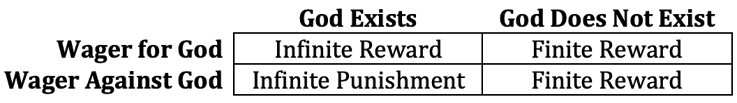 Pascal sets up a two-by-two matrix for his wager. There are four quadrants, one for each of the four possible outcomes: