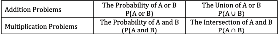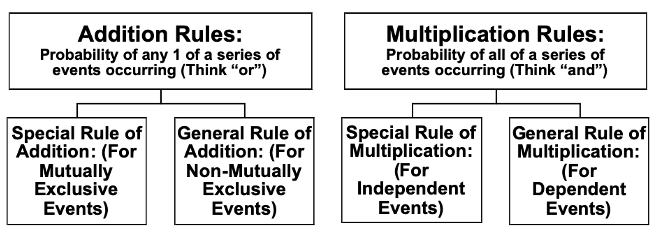 • Calculate probabilities using the special rule of addition, general rule of addition, the complement or subtraction rule, special rule of multiplication, and the general rule of multiplication.
