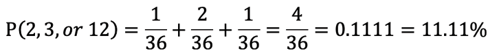 P(2, 3, or 12) = P(2) + P(3) + P(12) = 1/36 + 2/36 + 1/36 =