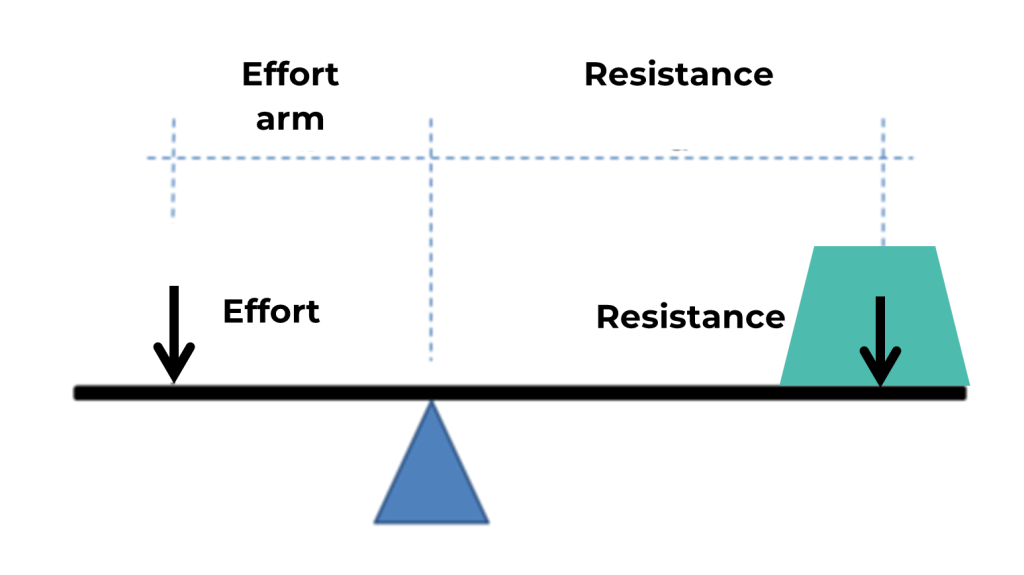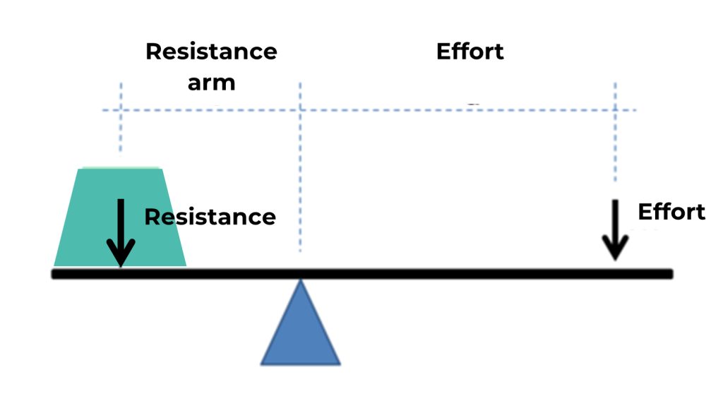 In order for movement to occur (e.g. when lifting a weight in your hand), the effort produced by one or several muscles needs to overcome the resistance. When the lever system is balanced, the two opposing forces applied at their respective distances from the fulcrum work to maintain a body posture or carry a particular weight without moving it. Thus, in a balanced lever system, the effort times the effort arm is equal to the resistance times the resistance arm. This is the basic formula used to calculate relationships between forces and distances in a lever system: