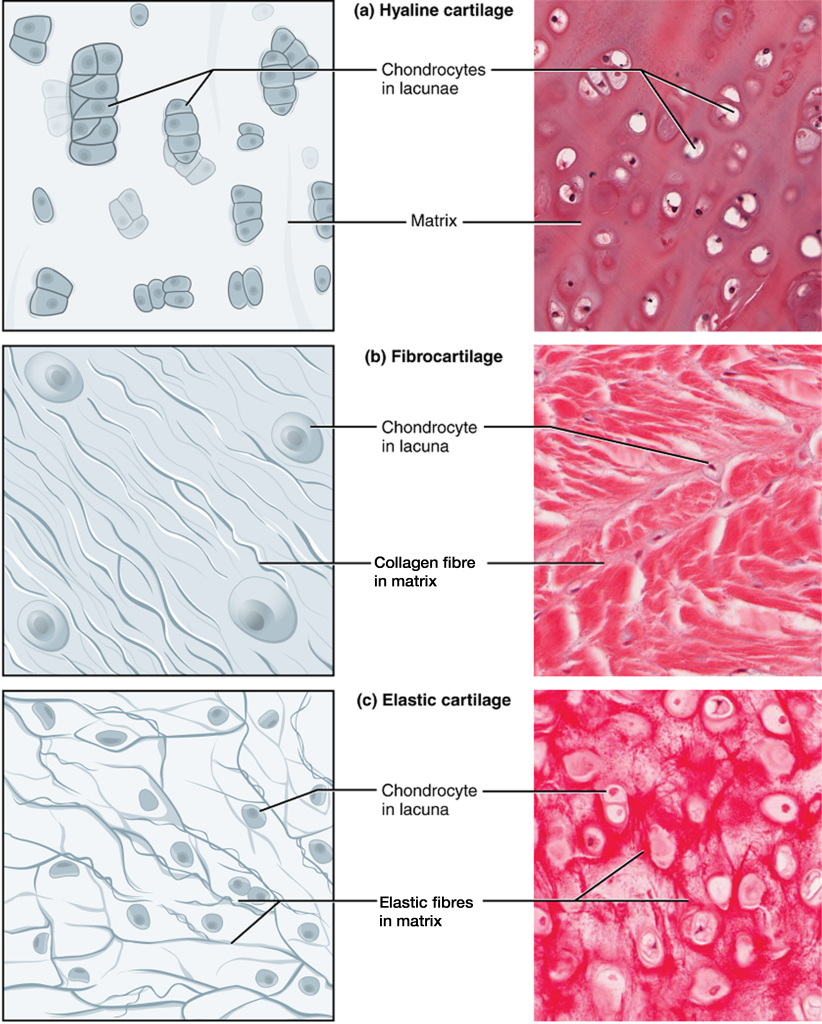 The three main types of cartilage tissue are hyaline cartilage, fibrocartilage, and elastic cartilage (Figure 8). Hyaline cartilage, the most common type of cartilage in the body, contains short and dispersed collagen fibres in the matrix. Both strong and flexible, the hyaline cartilage is found in the rib cage and nose and covers bones where they meet to form moveable joints. It makes up a template of the embryonic skeleton before bone formation. A plate of hyaline cartilage at the ends of bone allows continued growth until adulthood. Fibrocartilage is tough because it has thick bundles of collagen fibres dispersed through its matrix. The knee and jaw joints and the intervertebral discs are examples of fibrocartilage. Elastic cartilage contains elastic fibres as well as collagen. This tissue gives rigid support as well as elasticity. Tug gently at your ear lobes, and notice that the lobes return to their initial shape. The external ear contains elastic cartilage.