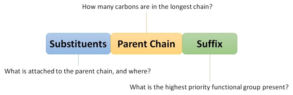 There is a one-carbon substituent on the third C atom, so there is a methyl group at position 3. We indicate the position using the number, which is followed by a hyphen, the substituent name, and the parent hydrocarbon name—in this case, 3-methylpentane. That name is specific to that particular hydrocarbon and no other molecule. Organic chemistry nomenclature is very specific following the general format shown in Figure 16.3 “IUPAC Nomenclature Guide.”