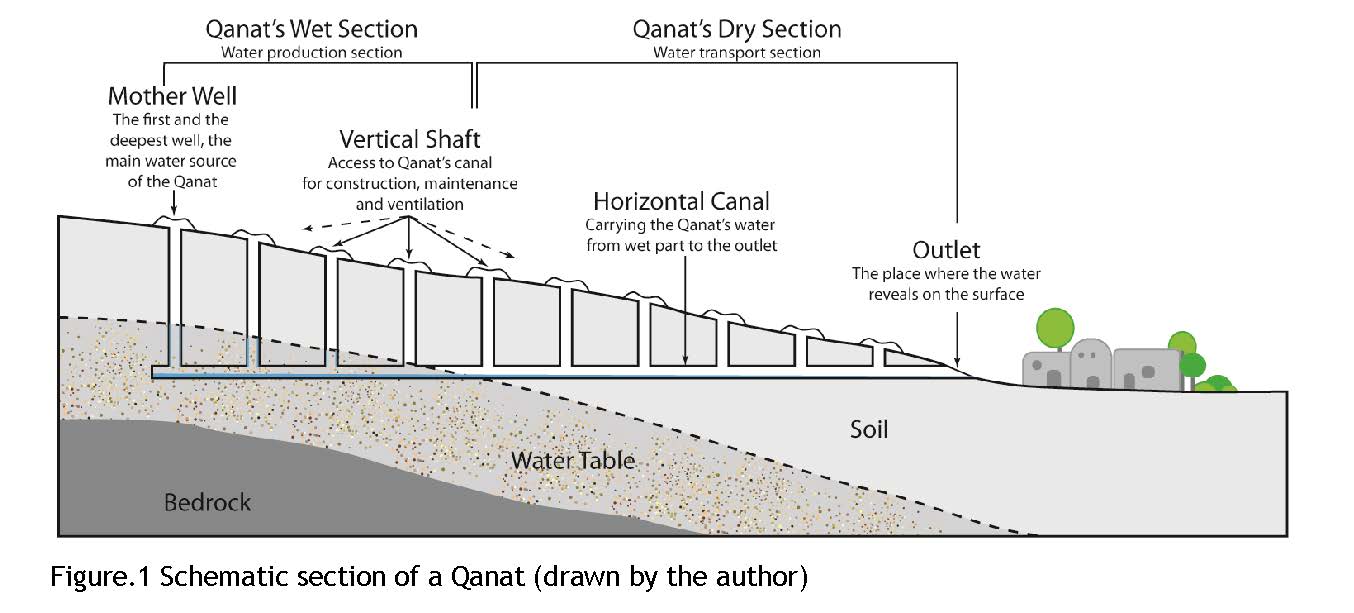 (Right) Typical section of Qanat (Drawing Source: Shamaeezadeh, 2015, p. 2).