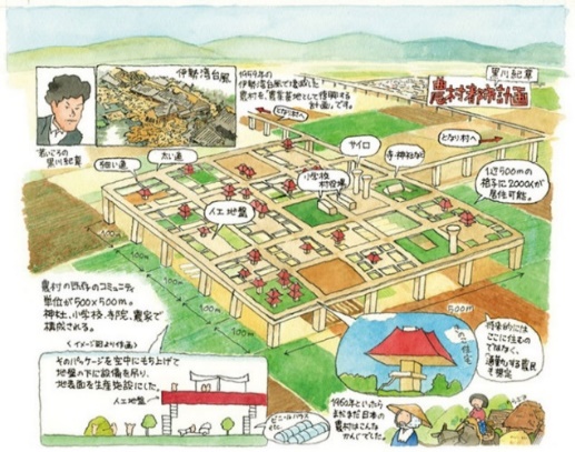 Agricultural City by the Metabolist Architect, Kisho Kurokawa in the 1960 reflects a modern, high-density urbanization reconfiguration that is intentionally bringing the rural landscape into urban living. Mega living structures represent mushroom-shaped houses elevated above concrete slabs. Positioning on a made grid and elevating over the agricultural soil enable living realms to breed their own food production facilities just beneath and self-sustain.17