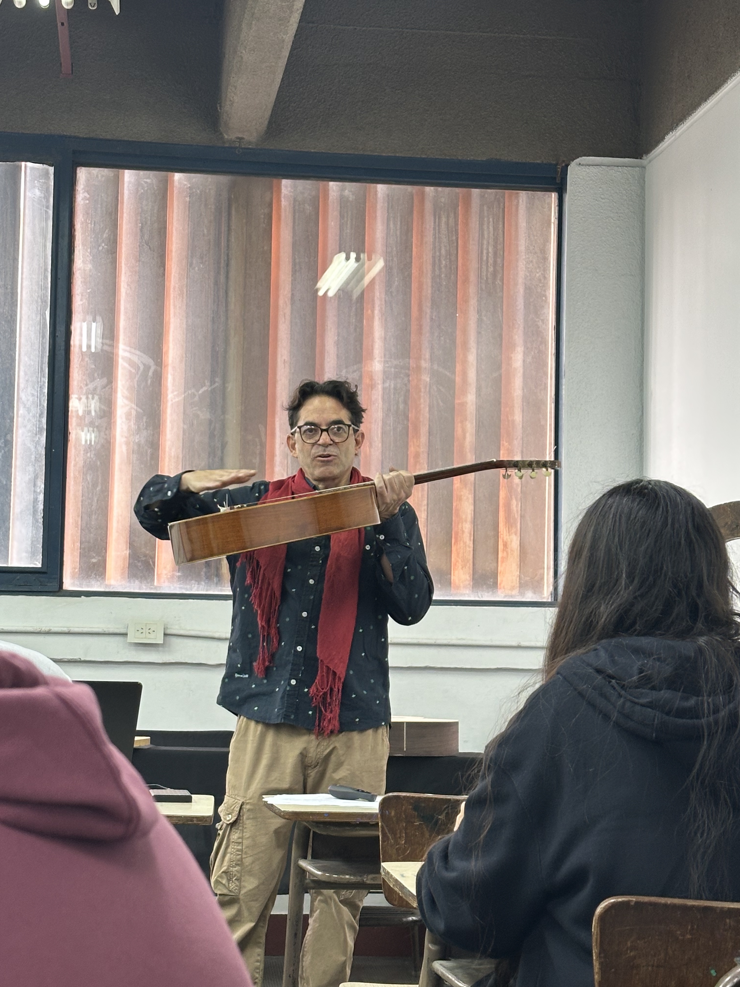 Figure 1: Luthier and UNT professor Juan Alonso discussing the Guitarra Tucumana during a workshop at the 6th Triennial of Lutherie. Photo by author, August 2025.