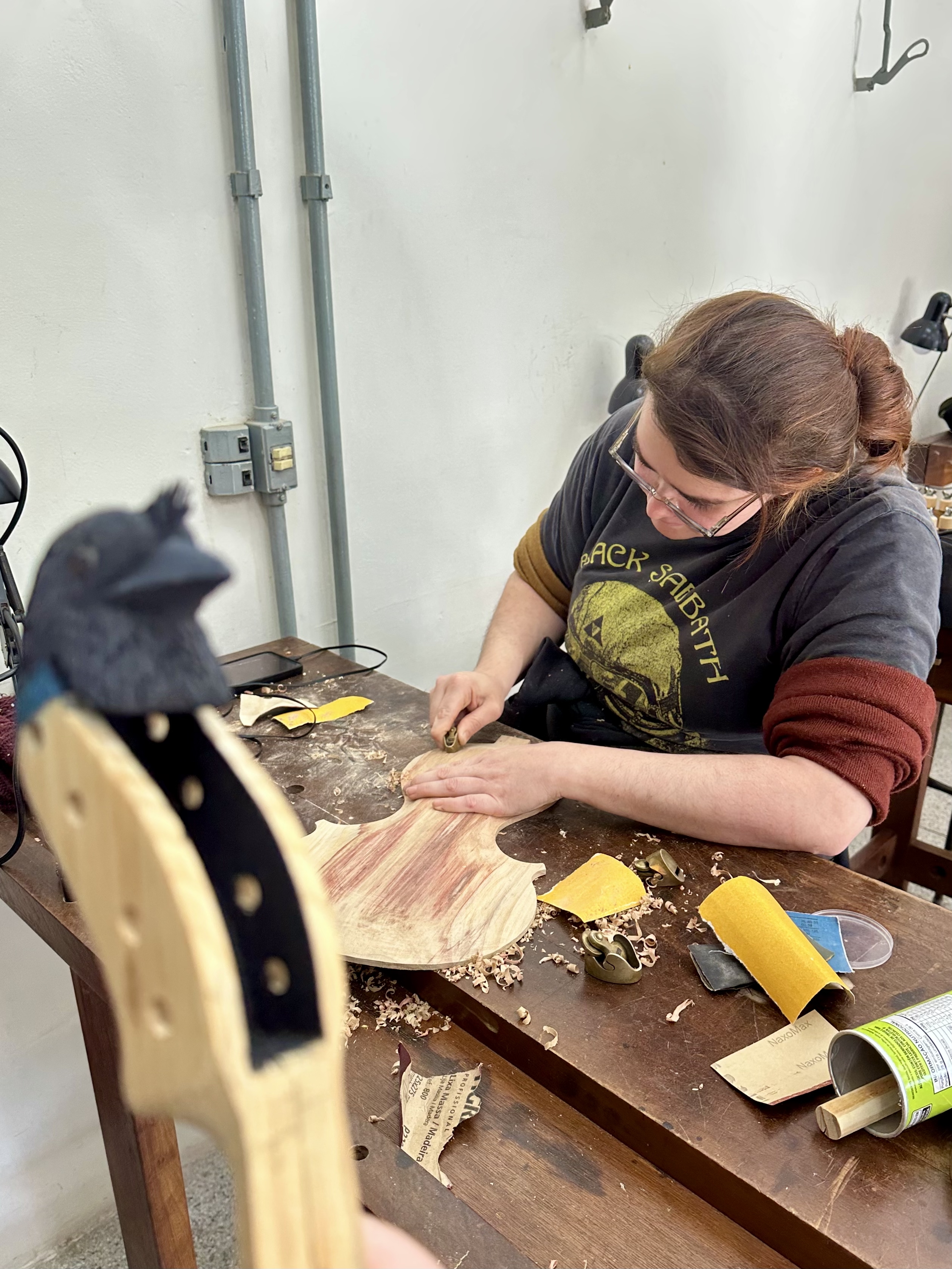 Figure 3: UFPR student Fernanda Ferreira building a folkloric rabeca caiçara from araucaria wood. Photo by author, June 2025.