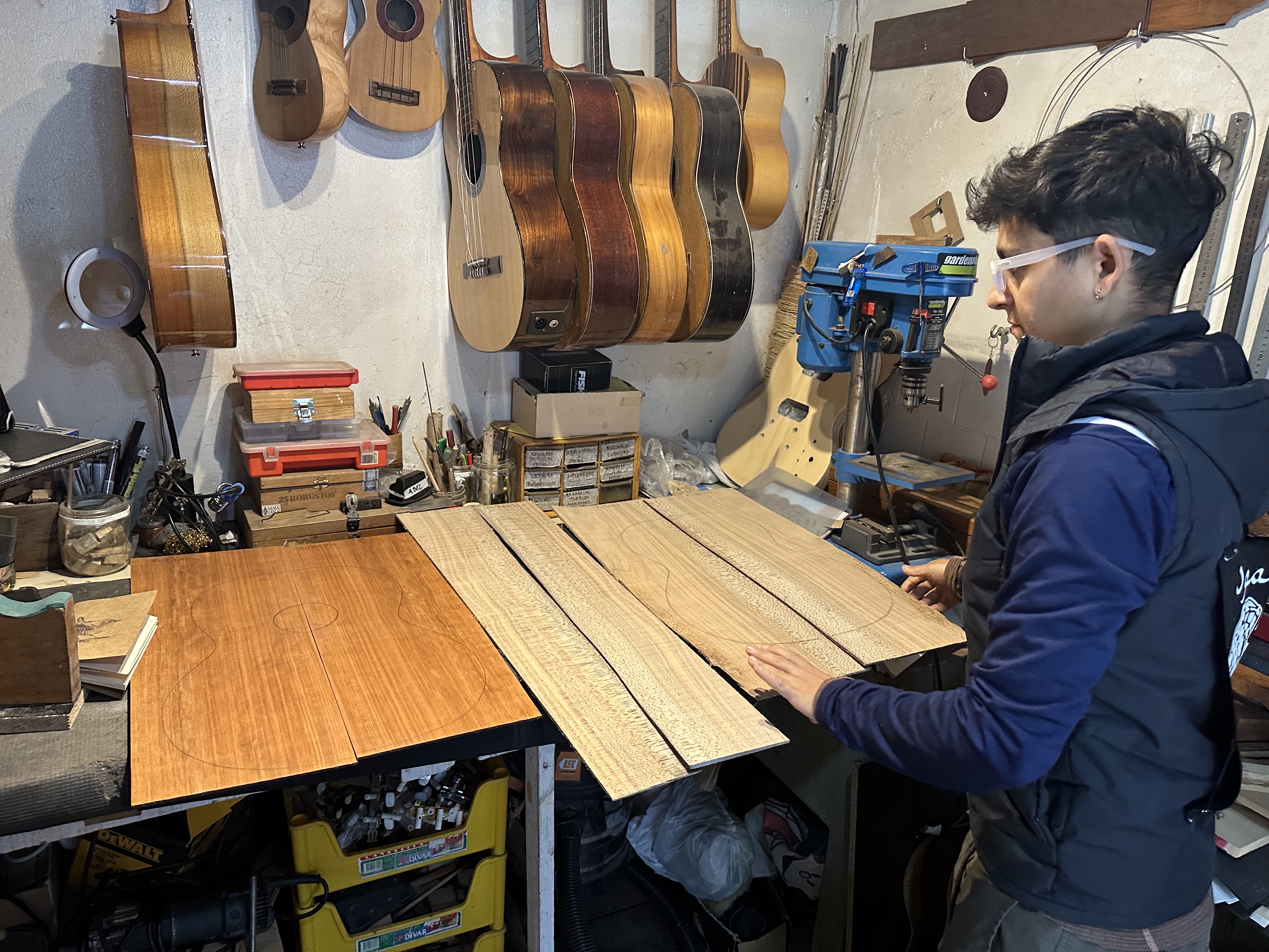 Figure 2: Wayun Luthier from Buenos Aires selecting alerce and radal wood for building a Guitarra Patagonica. Photo by author, August 2025.