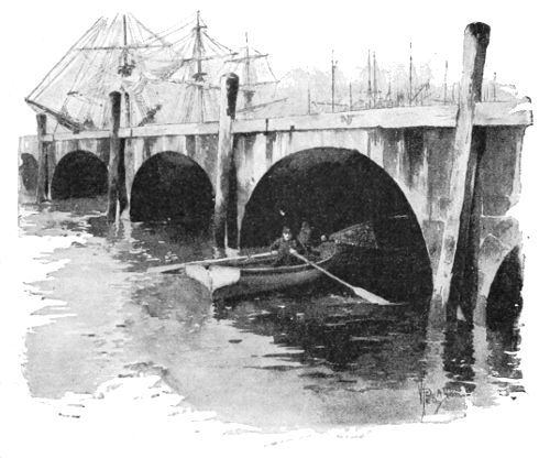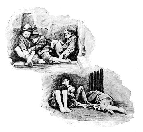 Anyone, whom business or curiosity has taken through Park Row or across Printing House Square in the midnight hour, when the air is filled with the roar of great presses spinning with printers’ ink on endless rolls of white paper the history of the world in the twenty-four hours that have just passed away, has seen little groups of these boys hanging about the newspaper offices; in winter, when snow is on the streets, fighting for warm spots around the grated vent-holes that let out the heat and steam from the underground press-rooms with their noise and clatter, and in summer playing craps and 7-11 on the curb for their hard-earned pennies, with all the absorbing concern of hardened gamblers. This is their beat. Here the agent of the Society for the Prevention of Cruelty to Children finds those he thinks too young for “business,” but does not always capture them. Like rabbits in their burrows, the little ragamuffins sleep with at least one eye open, and every sense alert to the approach of danger: of their enemy, the policeman, whose chief business in life is to move them on, and of the agent bent on robbing them of their cherished freedom. At the first warning shout they scatter and are off. To pursue them would be like chasing the fleet-footed mountain goat in his rocky fastnesses. There is not an open door, a hidden turn or runway which they do not know, with lots of secret passages and short cuts no one else ever found. To steal a march on them is the only way. There is a coal chute from the sidewalk to the boiler-room in the sub-cellar of the Post Office which the Society’s officer found the boys had made into a sort of toboggan slide to a snug berth in wintry weather. They used to slyly raise the cover in the street, slide down in single file, and snuggle up to the warm boiler out of harm’s way, as they thought. It proved a trap, however. The agent slid down himself one cold night—there was no other way of getting there—and, landing right in the midst of the sleeping colony, had it at his mercy. After repeated raids upon their headquarters, the boys forsook it last summer, and were next found herding under the shore-end of one of the East River banana docks, where they had fitted up a regular club-room that was shared by thirty or forty homeless boys and about a million rats.