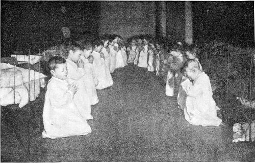 Four hundred and sixty mothers, who could not or would not keep their own babies, did voluntary penance for their sin in the asylum last year by nursing a strange waif besides their own until both should be strong enough to take their chances in life’s battle. An even larger number than the eleven hundred were “pay babies,” put out to be nursed by “mothers” outside the asylum. The money thus earned pays the rent of hundreds of poor families. It is no trifle, quite half of the quarter of a million dollars contributed annually by the city for the support of the asylum. The procession of these nurse-mothers, when they come to the asylum on the first Wednesday of each month to receive their pay and have the babies inspected by the sisters, is one of the sights of the city. The nurses, who are under strict supervision, grow to love their little charges and part from them with tears when, at the age of four or five, they are sent to Western homes to be adopted. The sisters carefully encourage the home-feeling in the child as their strongest ally in seeking its mental and moral elevation, and the toddlers depart happy to join their “papas and mammas” in the far-away, unknown home.