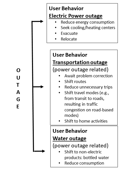 Figure 1 shows some of the hypothetical behaviors on the part of infrastructure users when an electric power outage affects infrastructure services not only for electric power but also for infrastructure services dependent on electric power. The elements portrayed are also applicable to other kinds of outages and infrastructure service disruptions.
