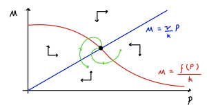 We therefore have one unique equilibrium. Let us call the value of f'(P^*)=\phi\lt 0 at the equilibrium. As such we can say that \det(J)=\mu\nu-k\phi is positive, meaning the equilibrium is stable. Whether the equilibrium is a node or a spiral then depends on the value of,