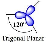 The three hybridized orbitals arrange in a trigonal planar structure with a bond angle of 120° following VSEPR (Figure 9.15 “A carbon atom’s trigonal planar sp2 hybridized orbitals”).