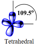According to VSEPR theory, the four degenerate orbitals will arrange as far apart from each other as possible, giving a tetrahedral geometry with each orbital 109.5o apart (Figure 9.12 “A carbon atom’s four tetrahedral sp3 hybridized orbitals”).