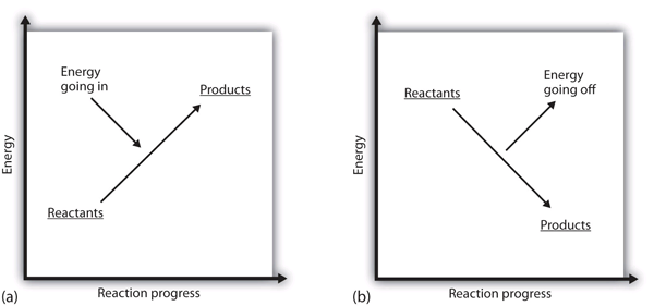An opposite situation exists for an exothermic process, as shown in part (b) in Figure 7.3 “Reaction Energy.” If the enthalpy change of a reaction is negative, the system is losing energy, so the products have less energy than the reactants, and the products are lower on the vertical energy scale than the reactants are. Exothermic, then, implies that the system loses, or gives off, energy.